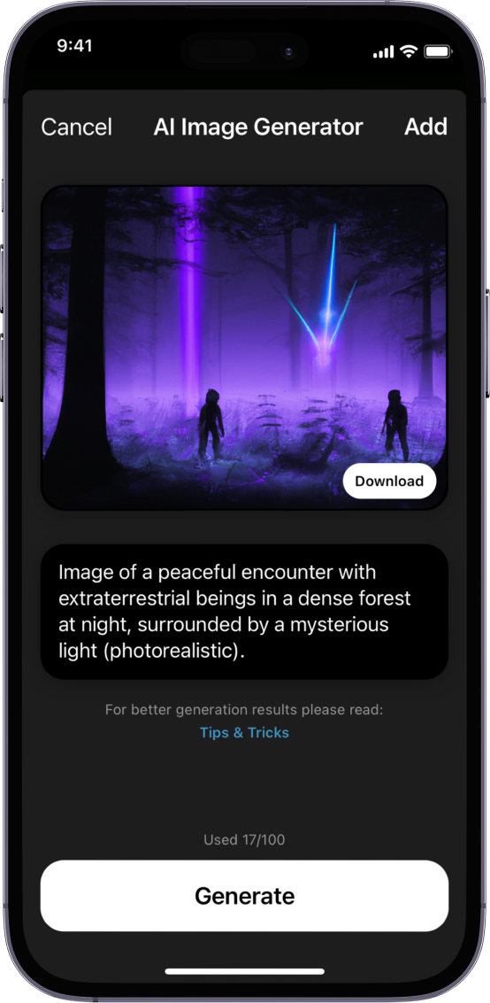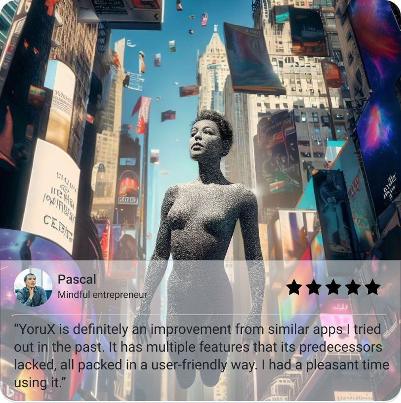 With a simple press of the "+" button, record your dreams or initiate discussions. Utilize our AI-powered image generator to bring your dreams to life, visualizing your sleep adventures in a novel and artistic way. Decide whether to keep these entries private for personal reflection, or share them publicly on the YoruX wall to contribute to our collective dream journey.