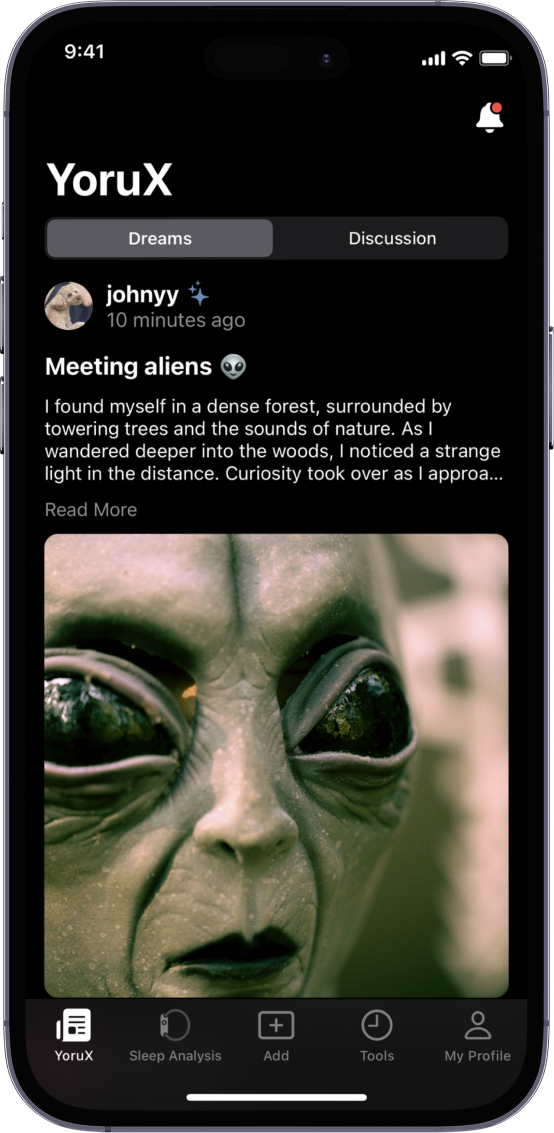 With a simple press of the "+" button, record your dreams or initiate discussions. Utilize our AI-powered image generator to bring your dreams to life, visualizing your sleep adventures in a novel and artistic way. Decide whether to keep these entries private for personal reflection, or share them publicly on the YoruX wall to contribute to our collective dream journey.